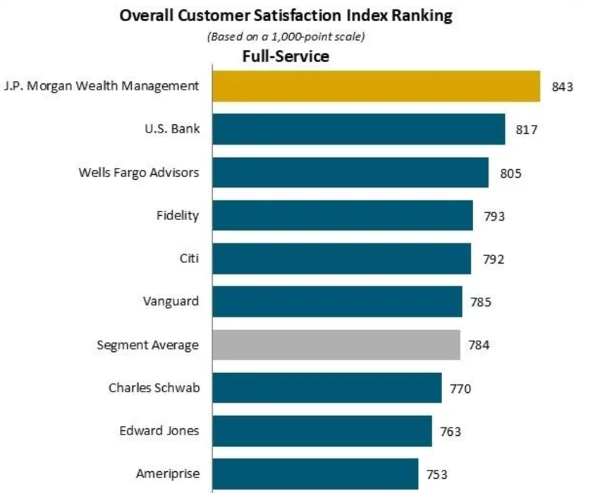 JP Morgan Wealth Management ranks highest in overall customer satisfaction with the full-service wealth management digital experience, with a score of 843. US Bank (817) ranks second and Wells Fargo Advisors (805) ranks third.