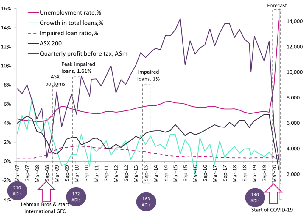 Given the expected scale and length of the disruption to the Australian economy, it’s no surprise that key banking indicators will suffer. The government stimulus measures for the banking sector and broader economy will limit the fallout, however, and at no time does it look like the banking sector will be pushed to the brink – even if profits suffer, there still will be profit. Even though NPLs will go up, it should be manageable given the government support. ADIs will suffer and not all will endure but it should be manageable.