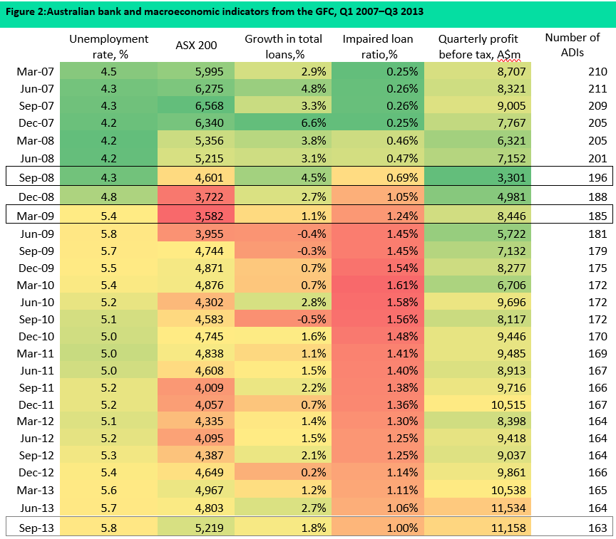 The mounting direct medical toll is predicted to be grim and the measures needed to contain it are also shaping up to be devastating to the economy. Ever a leading indicator, the ASX 200 has cratered with the benchmark index well and truly in bear market territory – over 30% down as of writing. Large swaths of the service economy have been closed with unemployment numbers mounting to levels not seen in modern history. While not an ideal comparison, the banking sector’s experience with the last international crisis, the 2008 GFC, is the best guide.