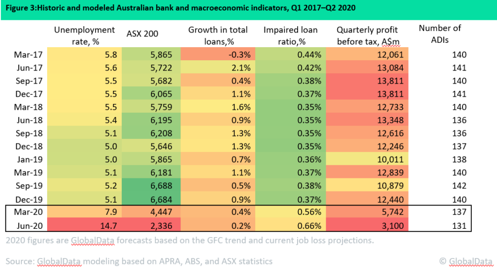 The medical effects of COVID-19 on Australia are still building, with caseloads rising and likely to continue doing so for some time. GlobalData examines the effects of the global financial crisis (GFC) for clues as to the impact on banks and the financial health of the nation, with implications not just for Australian banks but all mature banking markets facing down a COVID-19 recession. While still early days, indicators are that short-term bank profits will plummet, loan growths will stall, impaired loans will begin to rise, and the industry will see further consolidation.